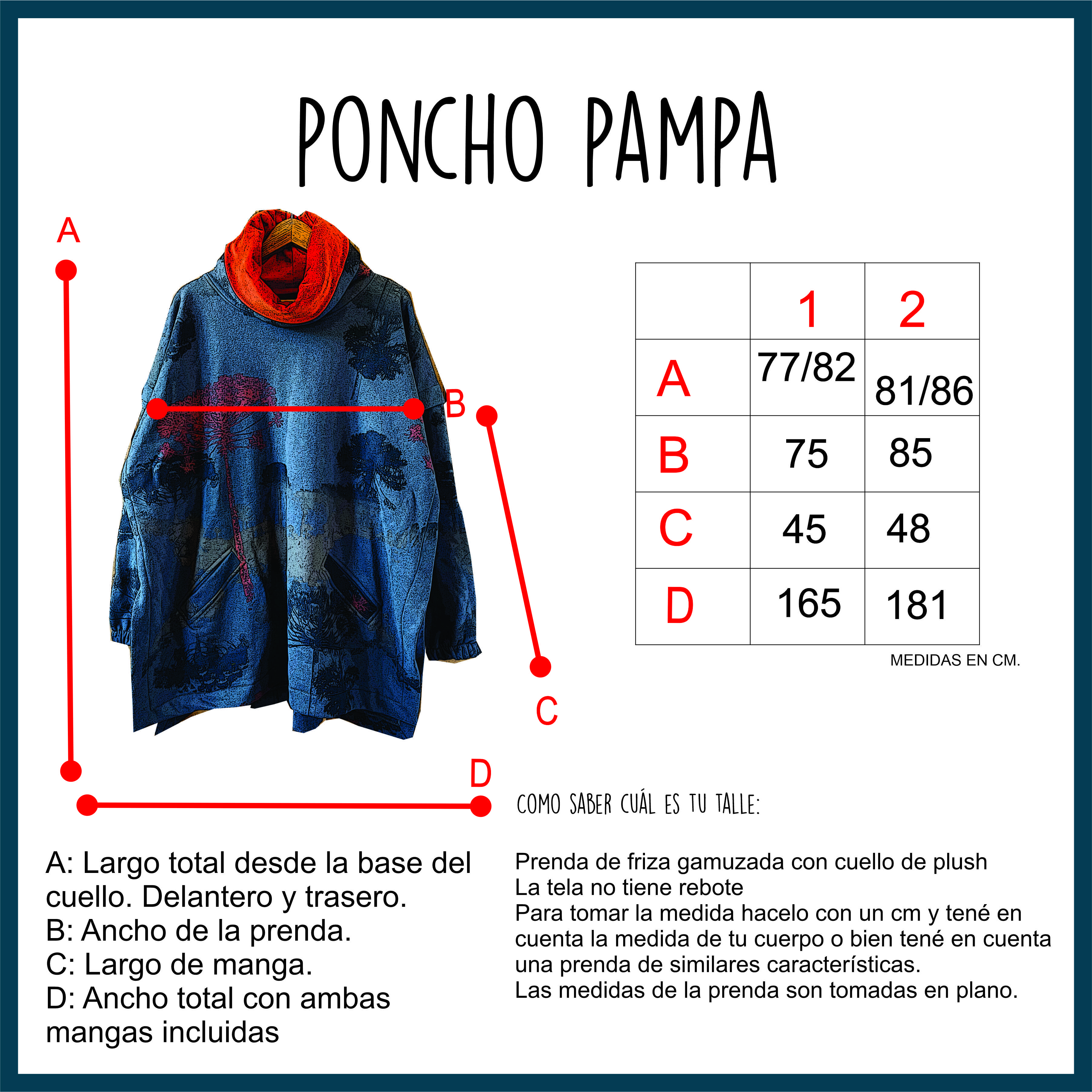 Poncho de friza con manga, estampado a mano en serigrafía. Tiene bolsillos delanteros de plush y cuello forrado con plush en su interior. El trasero es mas largo que el delantero y tiene tajos laterales.